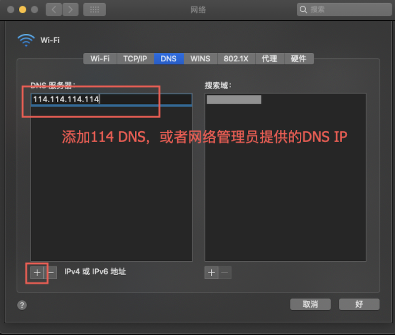 选择DNS标签页,点击+号添加DNS配置