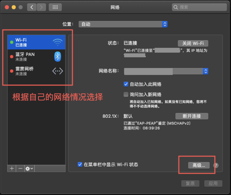 左侧选择合适的网络,点击“高级”